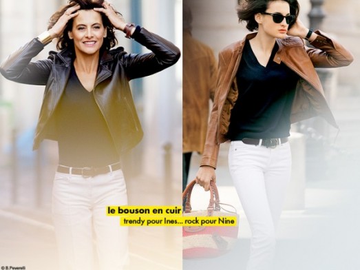 -białe rurki, skórzany ciemny pasek, ciemny t-shirt i skórzana kurtka